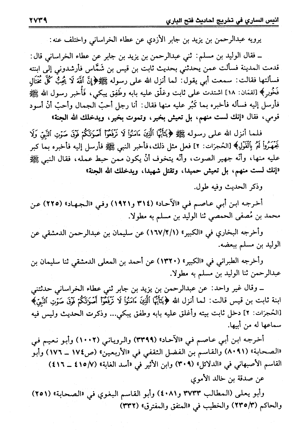 - وقال غير واحد: عن عبد الرحمن بن يزيد بن جابر ثني عطاء الخراساني حدثتني ابنة ثابت بن قيس قالت: لما أنزل الله {يَا أَيُّهَا الَّذِينَ آمَنُوا لَا تَرْفَعُوا أَصْوَاتَكُمْ فَوْقَ صَوْتِ النَّبِيِّ} [الحجرات: 2] دخل ثابت بيته وأغلق عليه بابه وطفق يبكي ... وذكرت الحديث وليس فيه سماعها له من أبيها.
