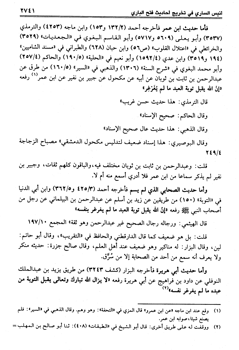 قلت: وعبد الرحمن بن ثابت بن ثوبان مختلف فيه، والباقون كلهم ثقات، وجبير بن نفير لم يذكر سماعا من ابن عمر فلا أدري أسمع منه أم لا.
