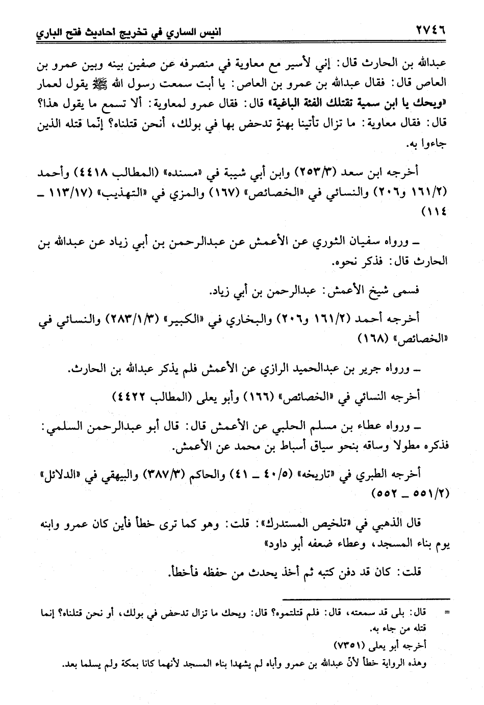 عبد الله بن الحارث قال: إني لأسير مع معاوية في منصرفه عن صفين بينه وبين عمرو بن العاص قال: فقال عبد الله بن عمرو بن العاص: يا أبت سمعت رسول الله - صلى الله عليه وسلم - يقول لعمار "ويحك يا ابن سمية تقتلك الفئة الباغية" قال: فقال عمرو لمعاوية: ألا تسمع ما يقول هذا؟ قال: فقال معاوية: ما تزال تأتينا بهنةٍ تدحض بها في بولك، أنحن قتلناه؟ إنّما قتله الذين جاءوا به.