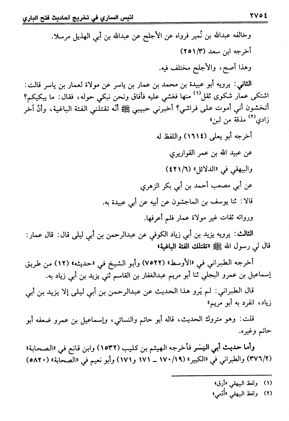 الثالث: يرويه يزيد بن أبي زياد الكوفي عن عبد الرحمن بن أبي ليلى قال: قال عمار: قال لي رسول الله - صلى الله عليه وسلم - "تقتلك الفئة الباغية"