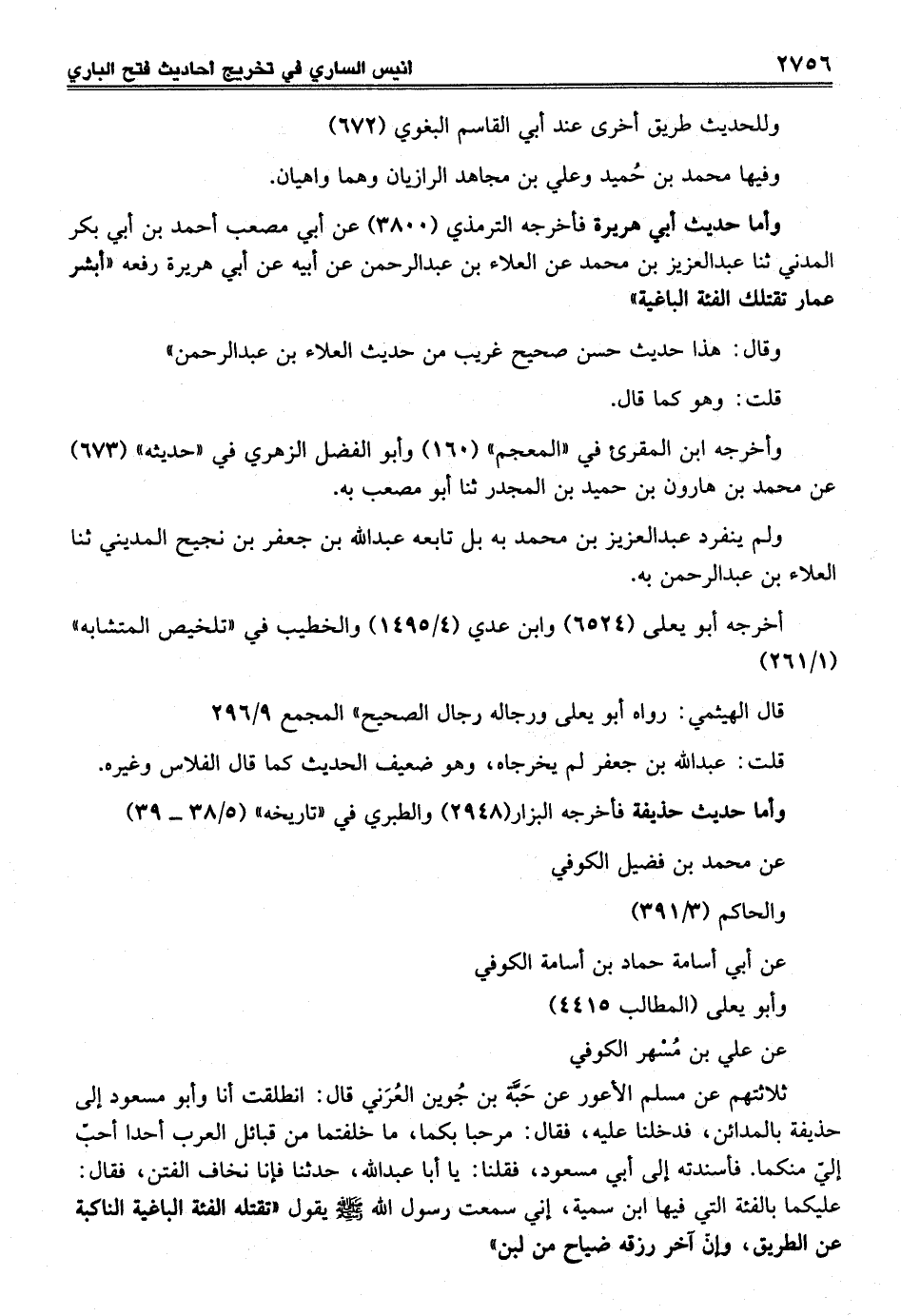 ثلاثتهم عن مسلم الأعور عن حَبَّة بن جُوين العُرَني قال: انطلقت أنا وأبو مسعود إلى حذيفة بالمدائن، فدخلنا عليه، فقال: مرحبا بكما خلفتما من قبائل العرب أحدا أحبّ إليّ منكما. فأسندته إلى أبي مسعود، فقلنا: يا أبا عبد الله، حدثنا فإنا نخاف الفتن، فقال: عليكما بالفئة التي فيها ابن سمية، إني سمعت رسول الله - صلى الله عليه وسلم - يقول "تقتله الفئة الباغية الناكبة عن الطريق، وإنّ آخر رزقه ضياح من لبن"