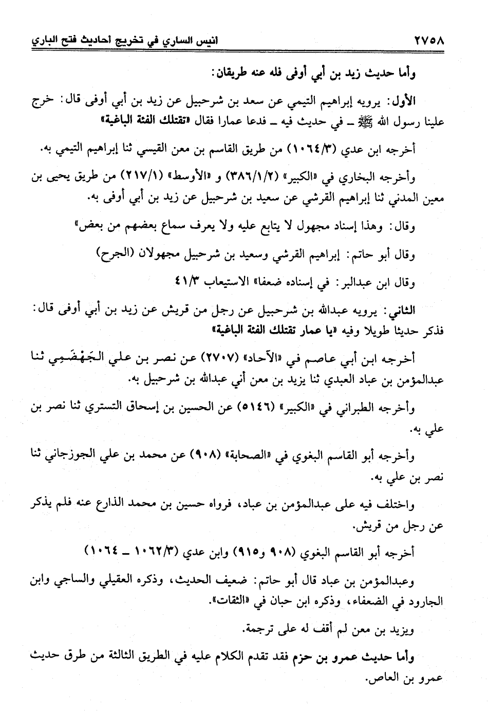 الأول: يرويه إبراهيم التيمي عن سعد بن شرحبيل عن زيد بن أبي أوفى قال: خرج علينا رسول الله - صلى الله عليه وسلم - في حديث فيه - فدعا عمارا فقال "تقتلك الفئة الباغية"