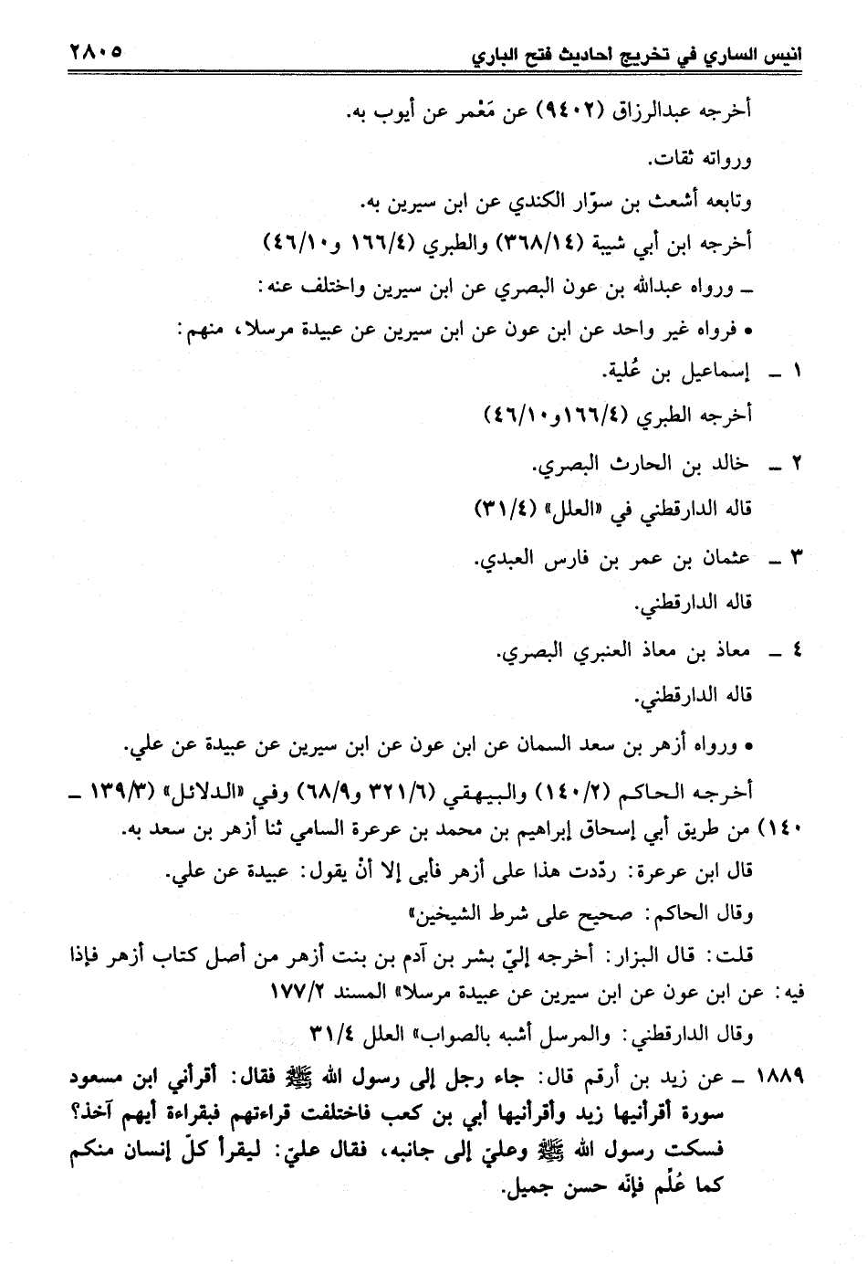 1889 - عن زيد بن أرقم قال: جاء رجل إلى رسول الله - صلى الله عليه وسلم - فقال: أقرأني ابن مسعود سورة أقرأنيها زيد وأقرأنيها أبي بن كعب فاختلفت قراءتهم فبقراءة أيهم آخذ؟ فسكت رسول الله - صلى الله عليه وسلم - وعليّ إلى جانبه، فقال عليّ: ليقرأ كلّ إنسان منكم كما عُلِّم فإنّه حسن جميل.