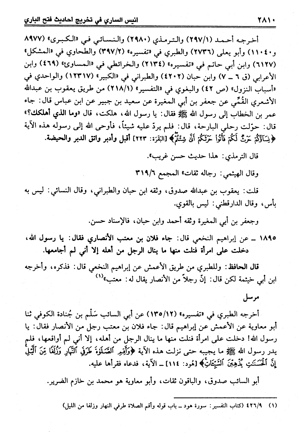 أخرجه أحمد (1/ 297) والترمذي (2980) والنسائي في "الكبرى" (8977 و 11040) وأبو يعلى (2736) والطبري في "تفسيره" (2/ 397) والطحاوي في "المشكل" (6127) وابن أبي حاتم في "تفسيره" (2134) والخرائطي في "المساوئ" (469) وابن الأعرابي (ق 6 - 7) وابن حبان (4202) والطبراني في "الكبير" (12317) والواحدي في "أسباب النزول" (ص 42) والبغوي في "التفسير" (1/ 218) من طريق يعقوب بن عبد الله الأشعري القُمِّي عن جعفر بن أبي المغيرة عن سعيد بن جبير عن ابن عباس قال: جاء عمر بن الخطاب إلى رسول الله - صلى الله عليه وسلم - فقال: يا رسول الله، هلكت، قال "وما الذي أهلكك؟ " قال: حوّلت رحلي البارحة، قال: فلم يردّ عليه شيئًا، فأوحى الله إلى رسوله هذه الآية {نِسَاؤُكُمْ حَرْثٌ لَكُمْ فَأْتُوا حَرْثَكُمْ أَنَّى شِئْتُمْ} [البقرة: 223] أقبل وأدبر واتق الدبر والحيضة.