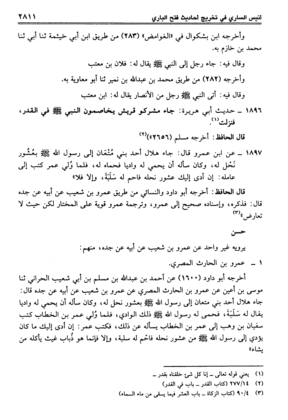 1897 - عن ابن عمرو قال: جاء هلال أحد بني مُتْعَان إلى رسول الله - صلى الله عليه وسلم - بعُشُور نَحْل له، وكان سأله أن يحمي له واديا فحماه له، فلما وُلي عمر كتب إلى عامله: إن أدى إليك عشور نحله فاحم له سَلَبَةَ، وإلا فلا"