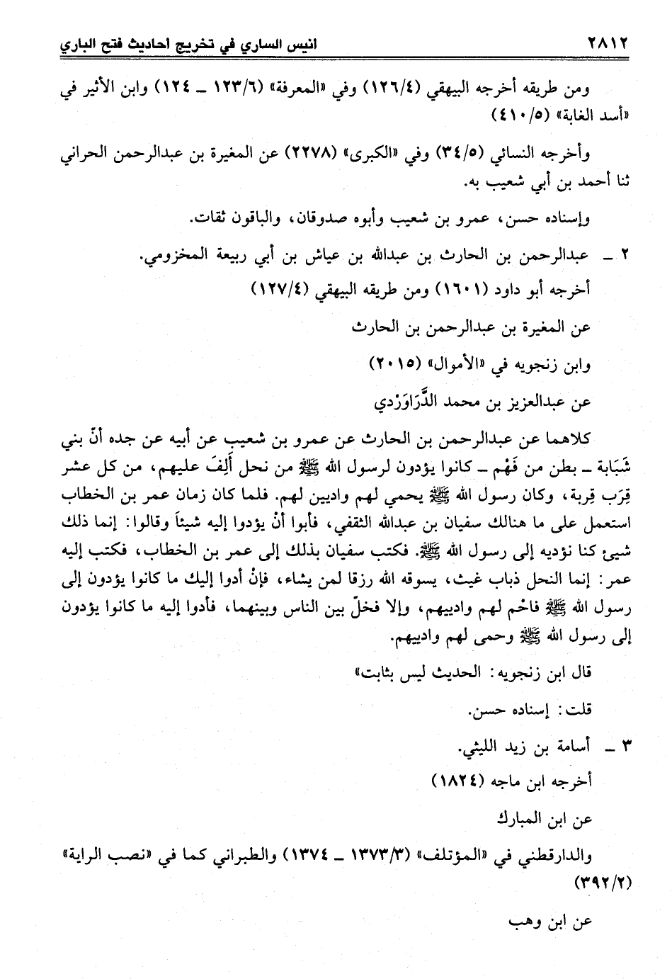 كلاهما عن عبد الرحمن بن الحارث عن عمرو بن شعيب عن أبيه عن جده أنّ بني شَبَابة- بطن من فَهْم- كانوا يؤدون لرسول الله - صلى الله عليه وسلم - من نحل أَلِفَ عليهم، من كل عشر قِرَب قِربة، وكان رسول الله - صلى الله عليه وسلم - يحمي لهم واديين لهم. فلما كان زمان عمر بن الخطاب استعمل على ما هنالك سفيان بن عبد الله الثقفي، فأبوا أنْ يؤدوا إليه شيئًا وقالوا: إنما ذلك شيء كنا نؤديه إلى رسول الله - صلى الله عليه وسلم -. فكتب سفيان بذلك إلى عمر بن الخطاب، فكتب إليه عمر: إنما النحل ذباب غيث، يسوقه الله رزقا لمن يشاء، فإنْ أدوا إليك ما كانوا يؤدون إلى رسول الله - صلى الله عليه وسلم - فاحْم لهم وادييهم، وإلا فخلّ بين الناس وبينهما، فأدوا إليه ما كانوا يؤدون إلى رسول الله - صلى الله عليه وسلم - وحمى لهم وادييهم.
