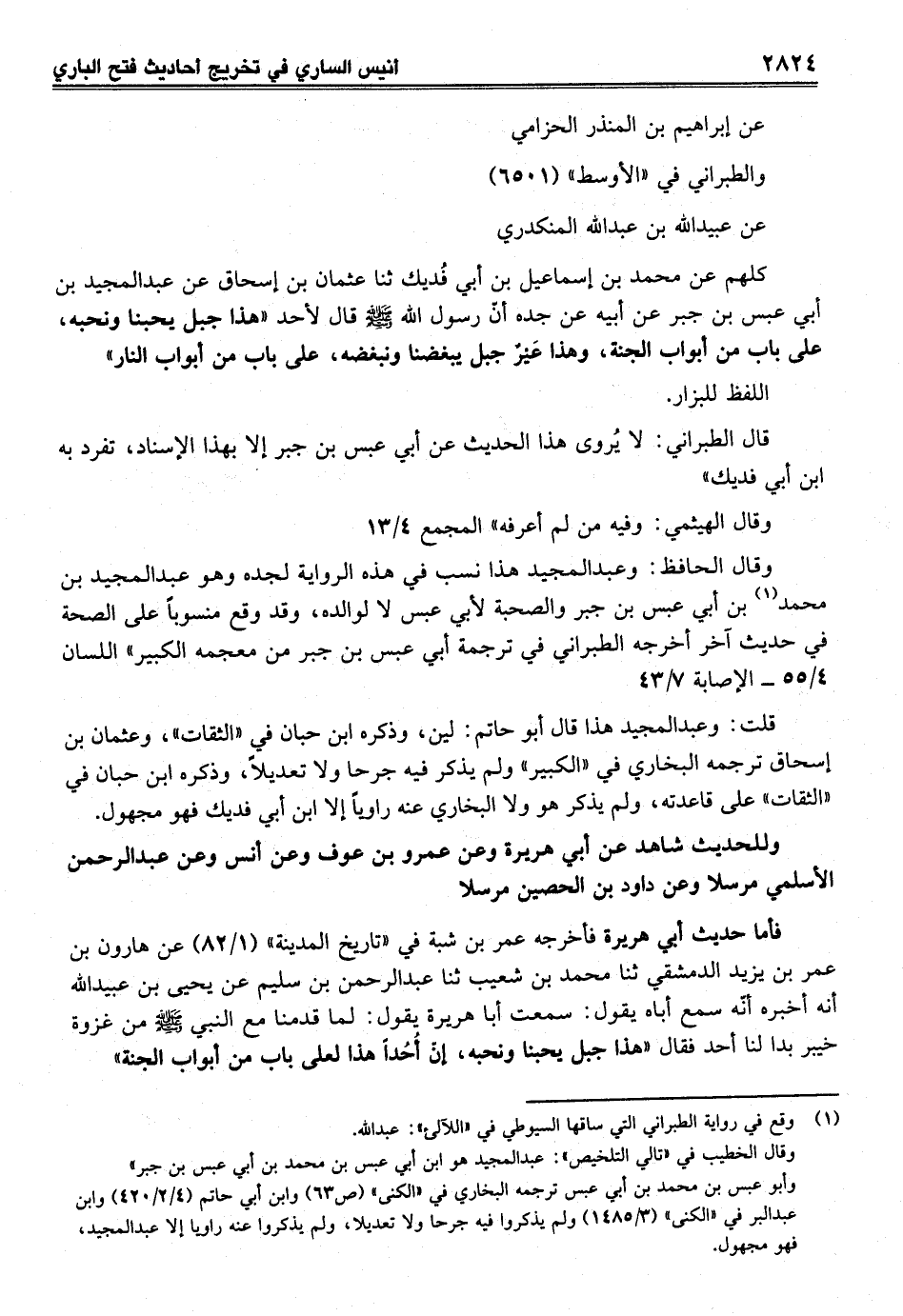 كلهم عن محمد بن إسماعيل بن أبي فُديك ثنا عثمان بن إسحاق عن عبد المجيد بن أبي عبس بن جبر عن أبيه عن جده أنّ رسول الله - صلى الله عليه وسلم - قال لأحد "هذا جبل يحبنا ونحبه، على باب من أبواب الجنة، وهذا عَيْرٌ جبل يبغضنا ونبغضه، على باب من أبواب النار"