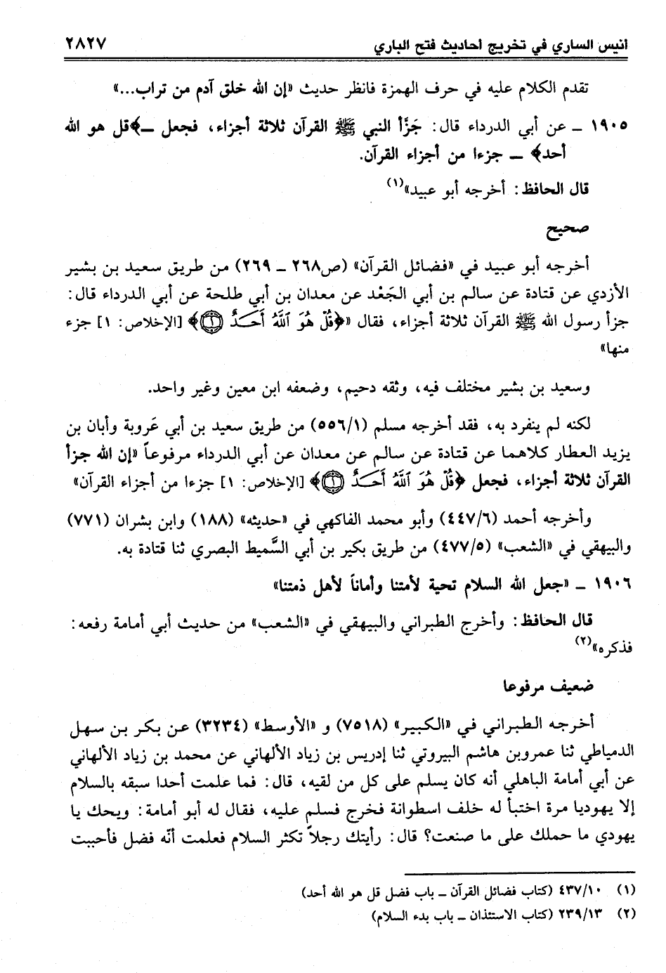 1905 - عن أبي الدرداء قال: جَزَّأ النبي - صلى الله عليه وسلم - القرآن ثلاثة أجزاء، فجعل- {قل هو الله أحد} - جزءا من أجزاء القرآن.