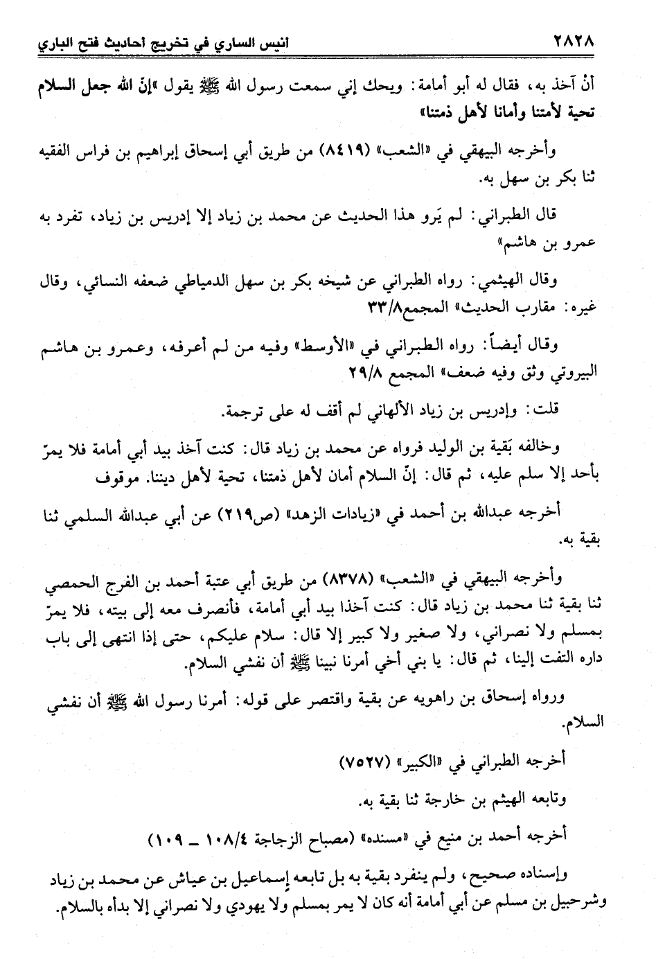 وخالفه بَقية بن الوليد فرواه عن محمد بن زياد قال: كنت آخذ بيد أبي أمامة فلا يمرّ بأحد إلا سلم عليه، ثم قال: إنّ السلام أمان لأهل ذمتنا، تحية لأهل ديننا. موقوف