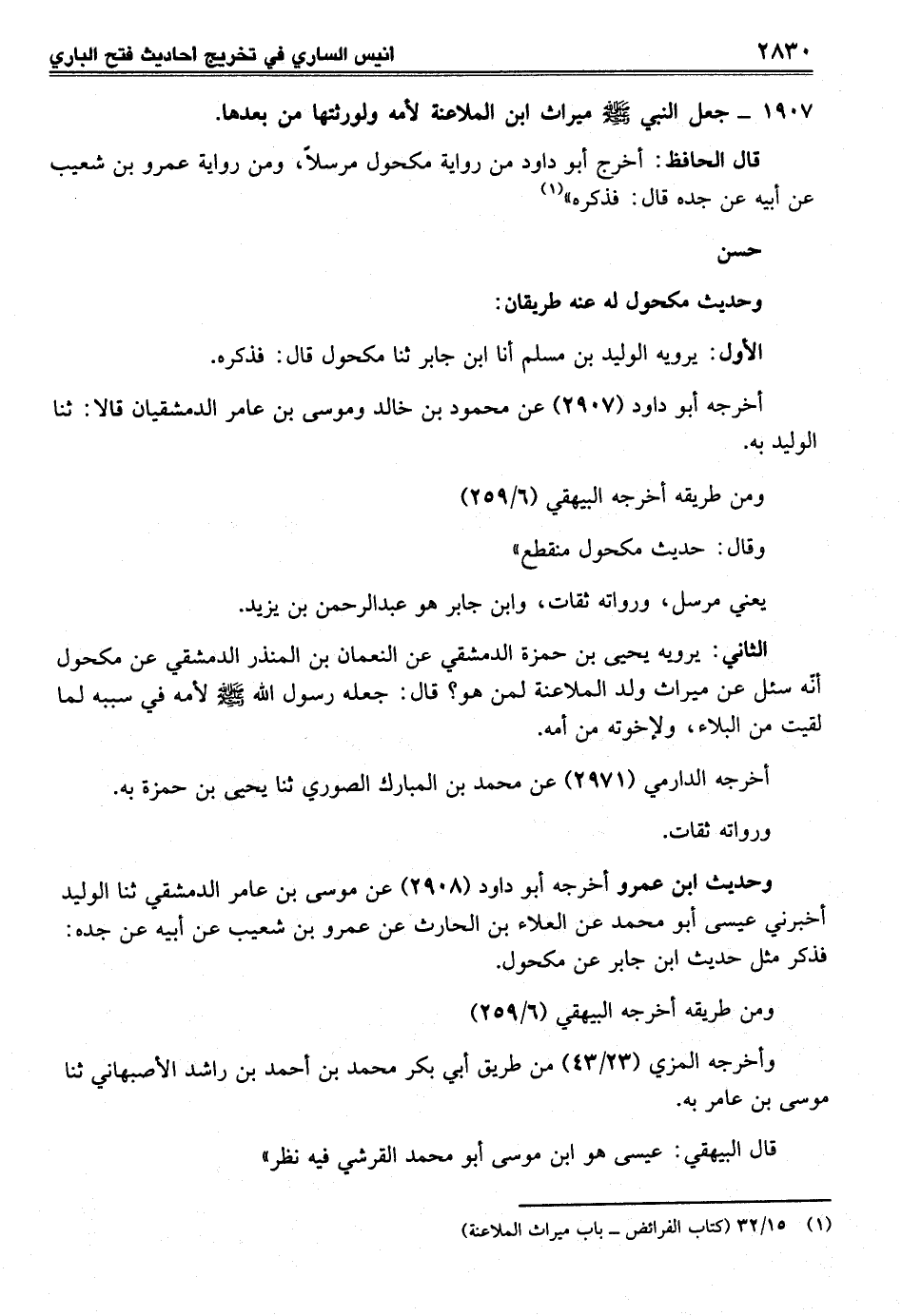 وحديث ابن عمرو أخرجه أبو داود (2908) عن موسى بن عامر الدمشقي ثنا الوليد أخبرني عيسى أبو محمد عن العلاء بن الحارث عن عمرو بن شعيب عن أبيه عن جده: فذكر مثل حديث ابن جابر عن مكحول.