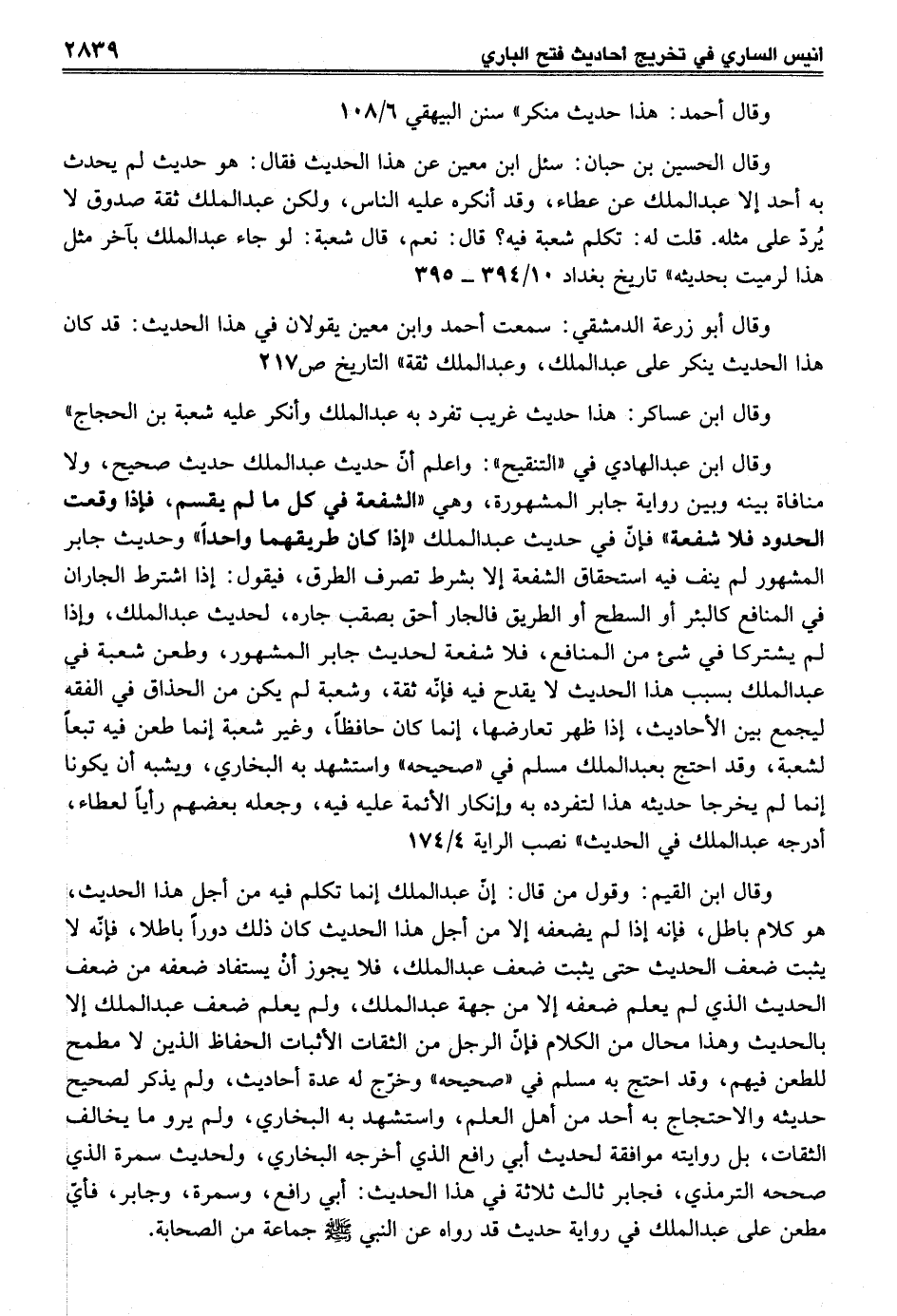 وقال ابن عبد الهادي في "التنقيح": واعلم أنّ حديث عبد الملك حديث صحيح، ولا منافاة بينه وبين رواية جابر المشهورة، وهي "الشفعة في كل ما لم يقسم، فإذا وقعت الحدود فلا شفعة" فإنّ في حديث عبد الملك "إذا كان طريقهما واحدًا" وحديث جابر المشهور لم ينف فيه استحقاق الشفعة إلا بشرط تصرف الطرق، فيقول: إذا اشترط الجاران في المنافع كالبئر أو السطح أو الطريق فالجار أحق بصقب جاره، لحديث عبد الملك، وإذا لم يشتركا في شئ من المنافع، فلا شفعة لحديث جابر المشهور، وطعن شعبة في عبد الملك بسبب هذا الحديث لا يقدح فيه فإنّه ثقة، وشعبة لم يكن من الحذاق في الفقه ليجمع بين الأحاديث، إذا ظهر تعارضها، إنما كان حافظًا، وغير شعبة إنما طعن فيه تبعًا لشعبة، وقد احتج بعبد الملك مسلم في "صحيحه" واستشهد به البخاري، ويشبه أن يكونا إنما لم يخرجا حديثه هذا لتفرده به وإنكار الأئمة عليه فيه، وجعله بعضهم رأيًا لعطاء، أدرجه عبد الملك في الحديث" نصب الراية 4/ 174