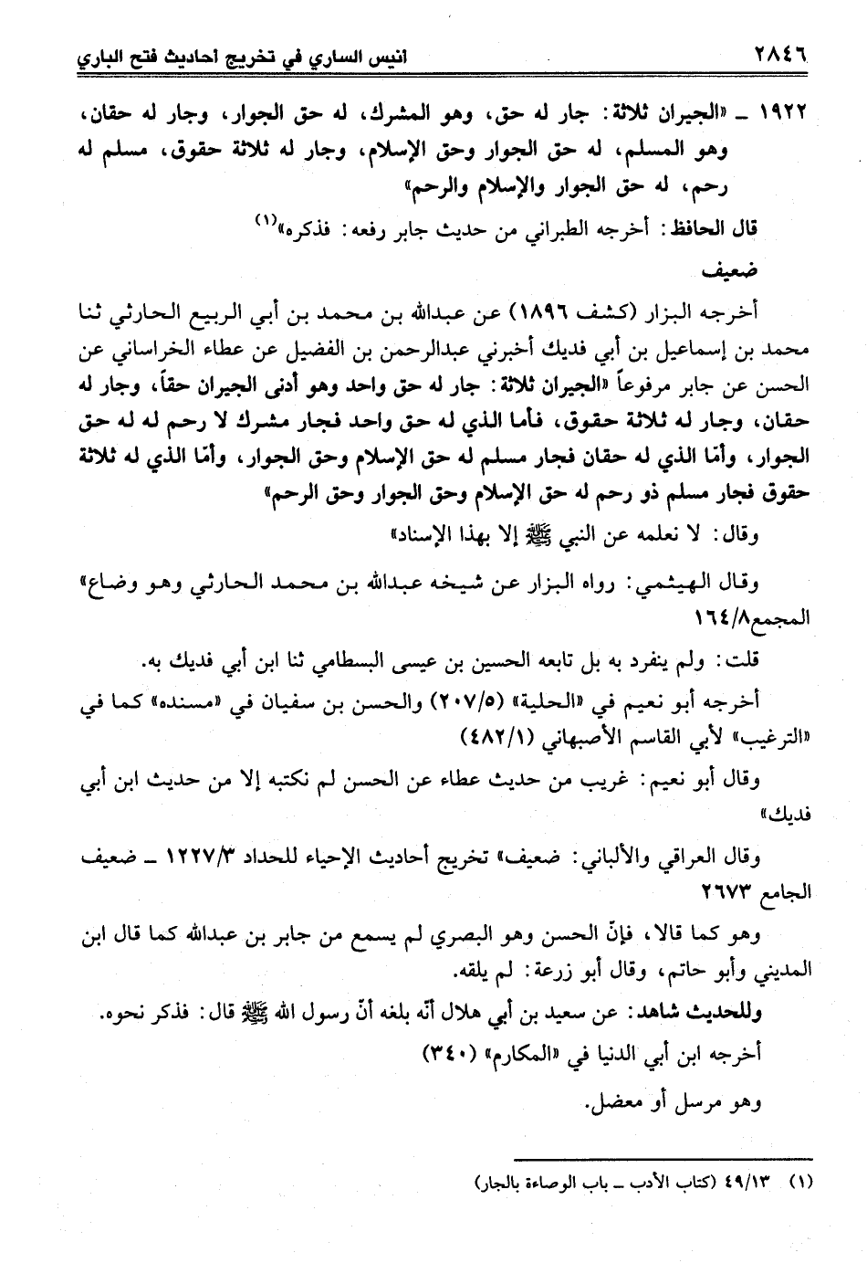 1922 - "الجيران ثلاثة: جار له حق، وهو المشرك، له حق الجوار، وجار له حقان، وهو المسلم، له حق الجوار وحق الإسلام، وجار له ثلاثة حقوق، مسلم له رحم، له حق الجوار والإسلام والرحم"