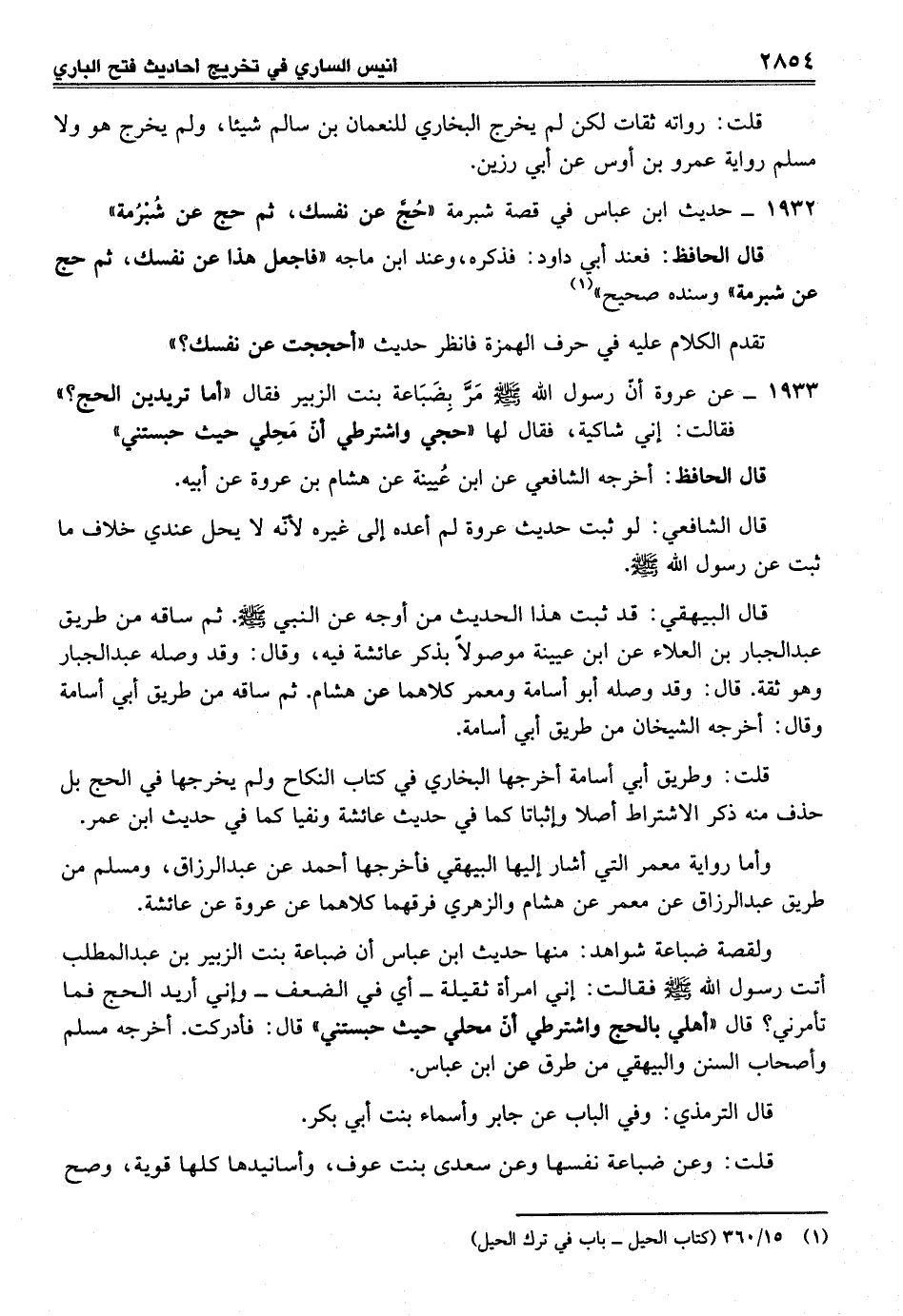 1933 - عن عروة أنّ رسول الله - صلى الله عليه وسلم - مَرَّ بِضَبَاعة بنت الزبير فقال "أما تريدين الحج؟ " فقالت: إني شاكية، فقال لها "حجي واشترطي أنّ مَحِلي حيث حبستني"