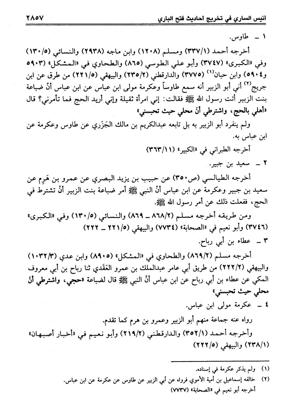 أخرجه الطيالسي (ص 350) عن حببب بن يزيد البصري عن عمرو بن هَرِم عن سعيد بن جبير وعكرمة عن ابن عباس أنّ النبي - صلى الله عليه وسلم - أمر ضباعة بنت الزبير أنْ تشترط في الحج، ففعلت ذلك عن أمر رسول الله - صلى الله عليه وسلم -.