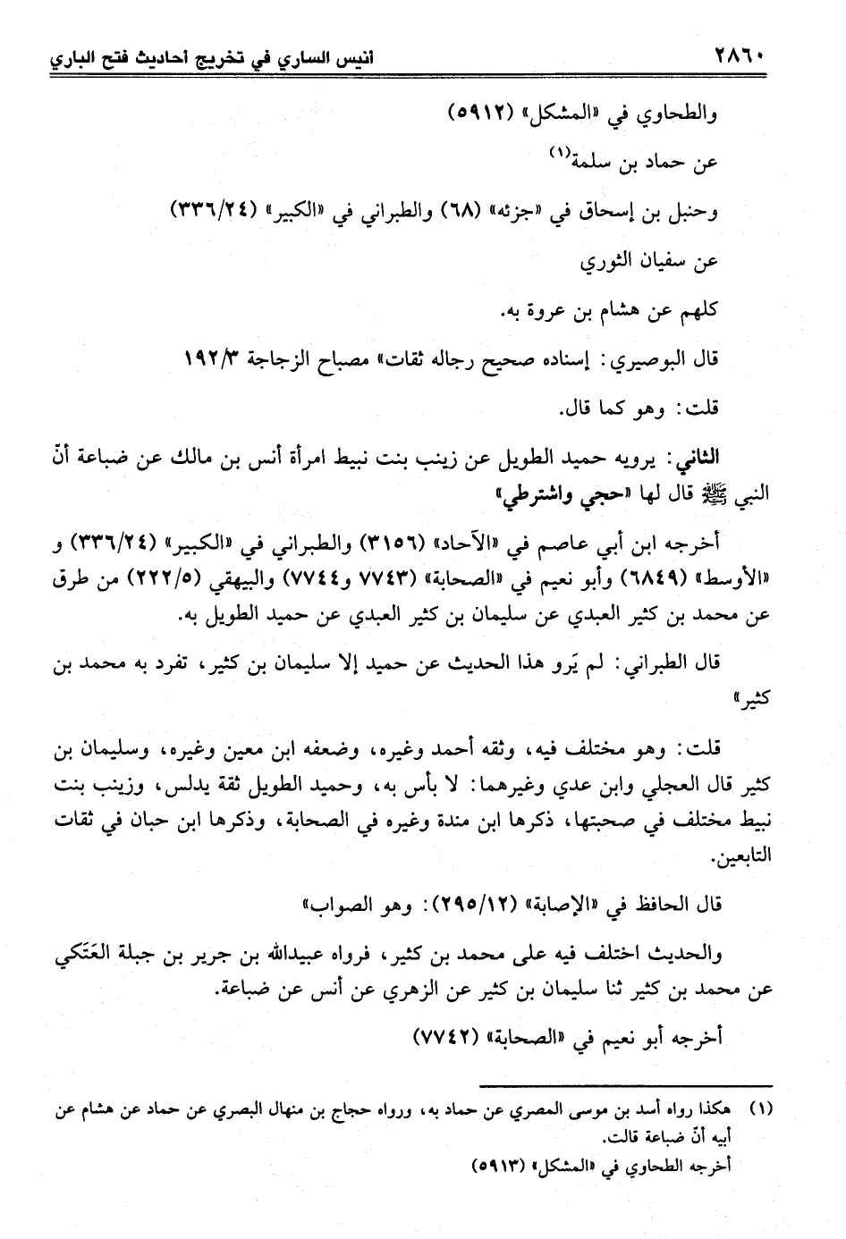 (¬1) هكذا رواه أسد بن موسى المصري عن حماد به، ورواه حجاج بن منهال البصري عن حماد عن هشام عن أبيه أنّ ضباعة قالت.