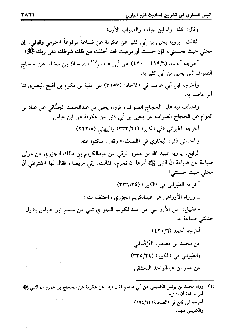 (¬1) رواه محمد بن يونس الكديمي عن أبي عاصم فقال فيه: عن عكرمة عن الحجاج بن عمرو أن النبي - صلى الله عليه وسلم - أمر ضباعة أن يشترط.