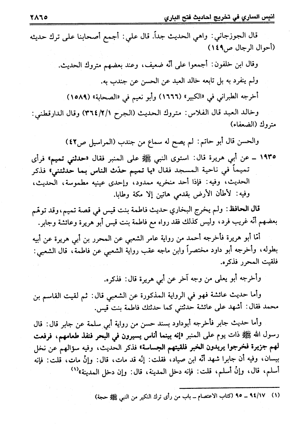 قال الحافظ: ولم يخرج البخاري حديث فاطمة بنت قيس في قصة تميم، وقد توّهم بعضهم أنّه غريب فرد، وليس كذلك فقد رواه مع فاطمة بنت قيس أبو هريرة وعائشة وجابر.