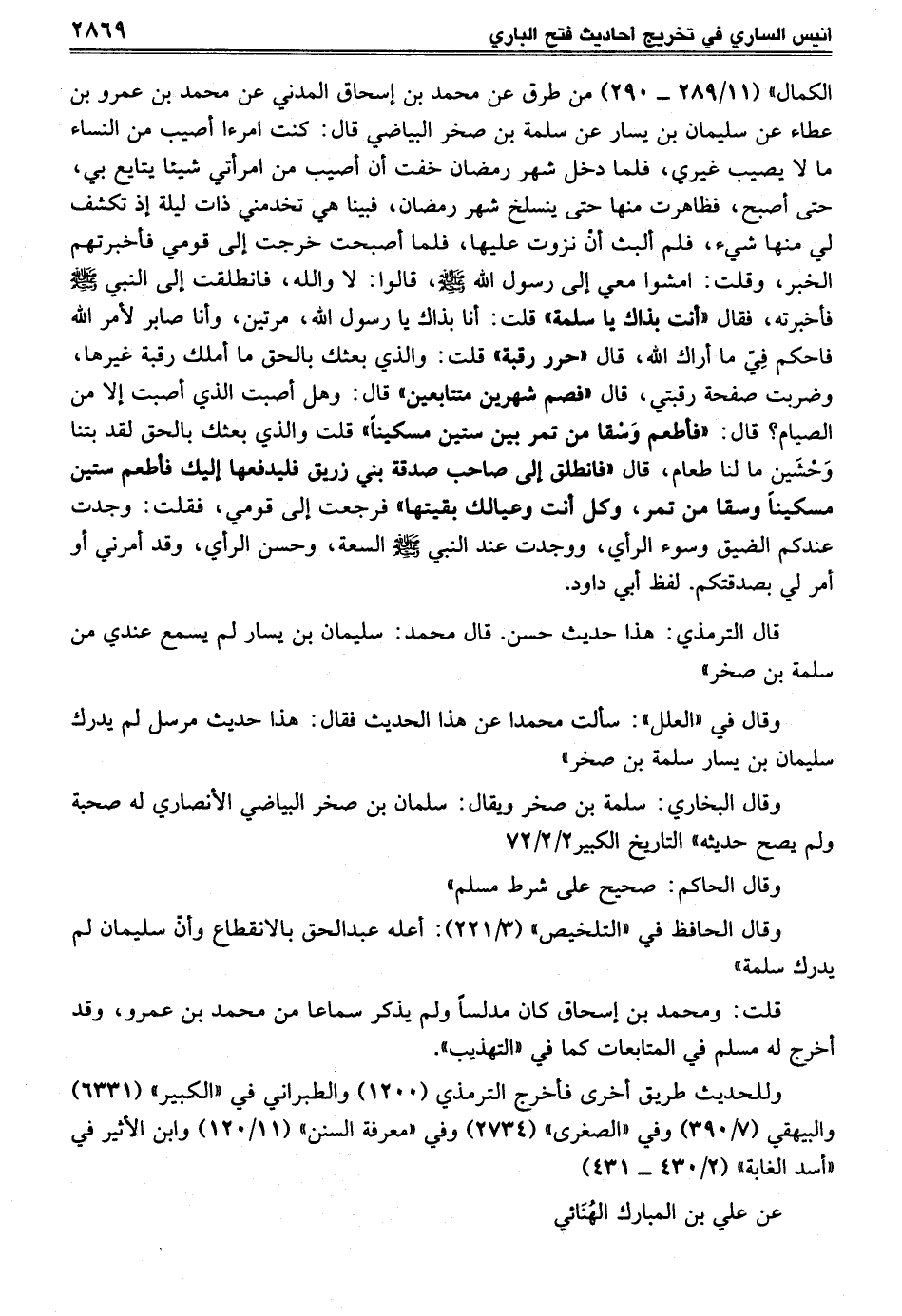 الكمال" (11/ 289 - 290) من طرق عن محمد بن إسحاق المدني عن محمد بن عمرو بن عطاء عن سليمان بن يسار عن سلمة بن صخر البياضي قال: كنت امرءا أصيب من النساء ما لا يصيب غيري، فلما دخل شهر رمضان خفت أن أصيب من امرأتي شيئا يتايع بي، حتى أصبح، فظاهرت منها حتى ينسلخ شهر رمضان، فبينا هي تخدمني ذات ليلة إذ تكشف لي منها شيء، فلم ألبث أنْ نزوت عليها، فلما أصبحت خرجت إلى قومي فأخبرتهم الخبر، وقلت: امشوا معي إلى رسول الله - صلى الله عليه وسلم -، قالوا: لا والله، فانطلقت إلى النبي - صلى الله عليه وسلم - فأخبرته، فقال "أنت بذاك يا سلمة" قلت: أنا بذاك يا رسول الله، مرتين، وأنا صابر لأمر الله فاحكم فِيّ ما أراك الله، قال "حرر رقبة" قلت: والذي بعثك بالحق ما أملك رقبة غيرها، وضربت صفحة رقبتي، قال "فصم شهرين متتابعين" قال: وهل أصبت الذي أصبت إلا من الصيام؟ قال: "فأطعم وَسْقا من تمر بين ستين مسكينًا" قلت والذي بعثك بالحق لقد بتنا وَحْشَين ما لنا طعام، قال "فانطلق إلى صاحب صدقة بني زريق فليدفعها إليك فأطعم ستين مسكينًا وسقا من تمر، وكل أنت وعيالك بقيتها" فرجعت إلى قومي، فقلت: وجدت عندكم الضيق وسوء الرأي، ووجدت عند النبي - صلى الله عليه وسلم - السعة، وحسن الرأي، وقد أمرني أو أمر لي بصدقتكم. لفظ أبي داود.