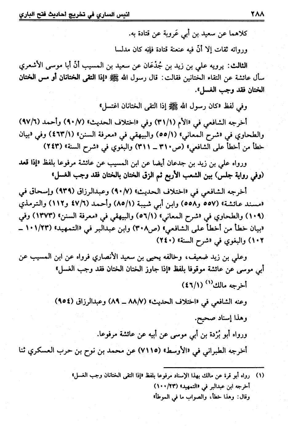 ورواه علي بن زيد بن جدعان أيضا عن ابن المسيب عن عائشة مرفوعا بلفظ "إذا قعد (وفي رواية جلس) بين الشعب الأربع ثم الزق الختان بالختان فقد وجب الغسل"