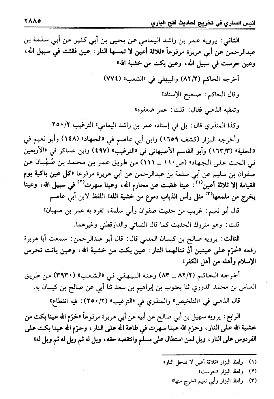 الثالث: يرويه صالح بن كيسان المدني قال: قال أبو عبد الرحمن: سمعت أبا هريرة رفعه "حُرّم على عينين أنْ تنالهما النار: عين بكت من خشية الله، وعين باتت تحرس الإسلام وأهله من أهل الكفر"