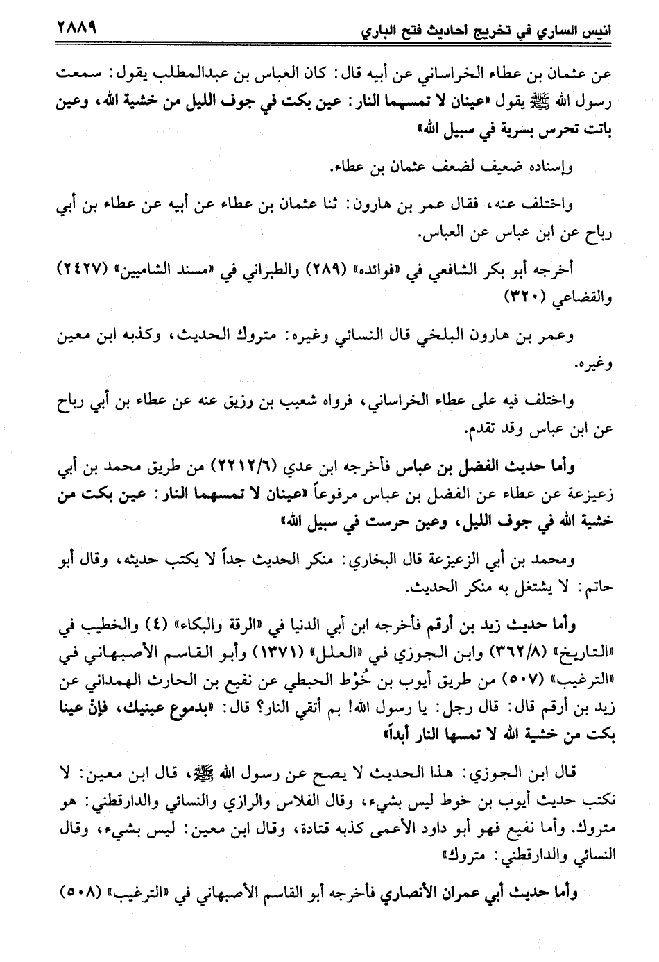 عن عثمان بن عطاء الخراساني عن أبيه قال: كان العباس بن عبد المطلب يقول: سمعت رسول الله - صلى الله عليه وسلم - يقول "عينان لا تمسهما النار: عين بكت في جوف الليل من خشية الله، وعين باتت تحرس بسرية في سبيل الله"
