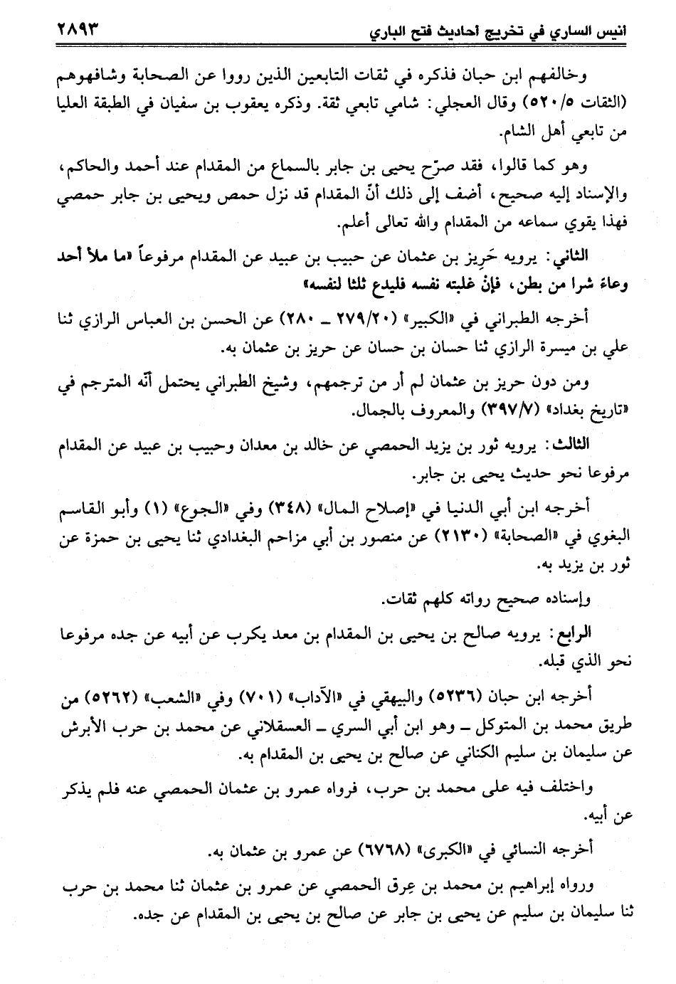 الثاني: يرويه حَرِيز بن عثمان عن حبيب بن عبيد عن المقدام مرفوعا "ما ملأ أحد وعاءً شرا من بطن، فإنْ غلبته نفسه فليدع ثلثا لنفسه"