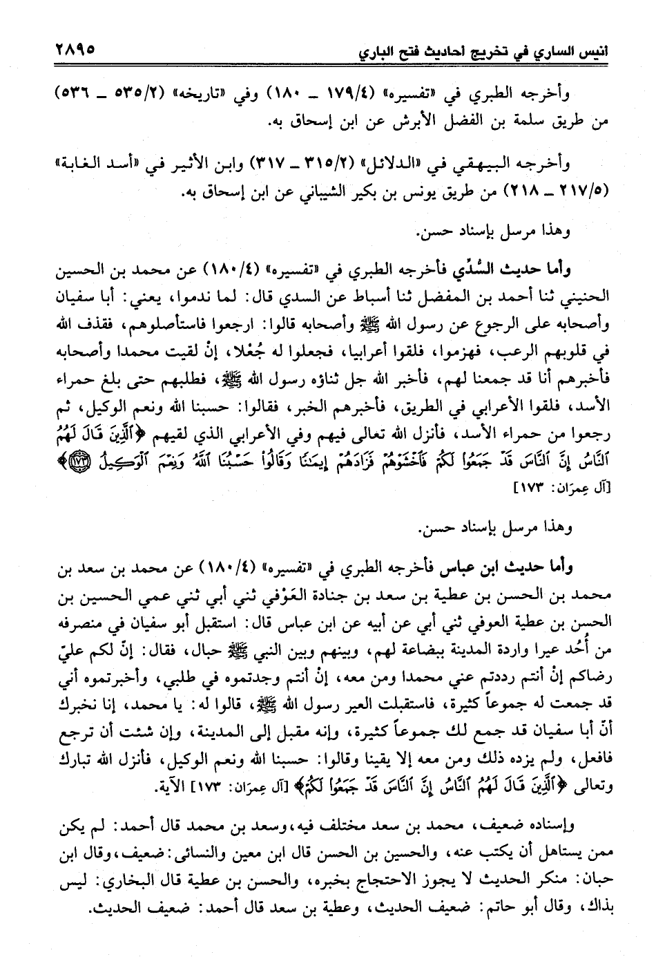 وأما حديث ابن عباس فأخرجه الطبري في "تفسيره" (4/ 180) عن محمد بن سعد بن محمد بن الحسن بن عطية بن سعد بن جنادة العَوْفي ثني أبي ثني عمي الحسين بن الحسن بن عطية العوفي ثني أبي عن أبيه عن ابن عباس قال: استقبل أبو سفيان في منصرفه من أُحُد عيرا واردة المدينة ببضاعة لهم، وبينهم وبين النبي - صلى الله عليه وسلم - حبال، فقال: إنّ لكم علىّ رضاكم إنْ أنتم رددتم عني محمدا ومن معه، إنْ أنتم وجدتموه في طلبي، وأخبرتموه أني قد جمعت له جموعًا كثيرة، فاستقبلت العير رسول الله - صلى الله عليه وسلم -، قالوا له: يا محمد، إنا نخبرك أنّ أبا سفيان قد جمع لك جموعًا كثيرة، وإنه مقبل إلى المدينة، وإن شئت أن ترجع فافعل، ولم يزده ذلك ومن معه إلا يقينا وقالوا: حسبنا الله ونعم الوكيل، فأنزل الله تبارك وتعالى {الَّذِينَ قَالَ لَهُمُ النَّاسُ إِنَّ النَّاسَ قَدْ جَمَعُوا لَكُمْ} [آل عمران: 173] الآية.