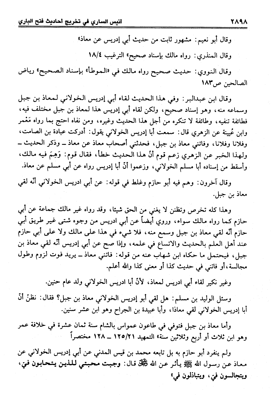 وقال ابن عبد البر: وفي هذا الحديث لقاء أبي إدريس الخولاني لمعاذ بن جبل وسماعه منه، وهو إسناد صحيح، ولكن لقاء أبي إدريس هذا لمعاذ بن جبل مختلف فيه، فطائفة تنفيه، وطائفة لا تنكره من أجل هذا الحديث وغيره، ومن نفاه احتج بما رواه مَعْمر وابن عُيينة عن الزهري قال: سمعت أبا إدريس الخولاني يقول: أدركت عبادة بن الصامت، وفلانا وفلانا، وفاتني معاذ بن جبل، فحدثني أصحاب معاذ عن معاذ- وذكر الحديث- ولهذا الخبر عن الزهري زعم قوم أنّ هذا الحديث خطأ، فقال قوم: وَهِمَ فيه مالك، وأسقط من إسناده أبا مسلم الخولاني، وزعموا أنّ أبا إدريس رواه عن أبي مسلم عن معاذ.