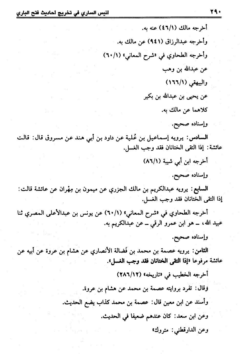 الثامن: يرويه عصمة بن محمَّد بن فَضالة الأنصاري عن هشام بن عروة عن أبيه عن عائشة مرفوعا "إذا التقى الختانان فقد وجب الغسل".