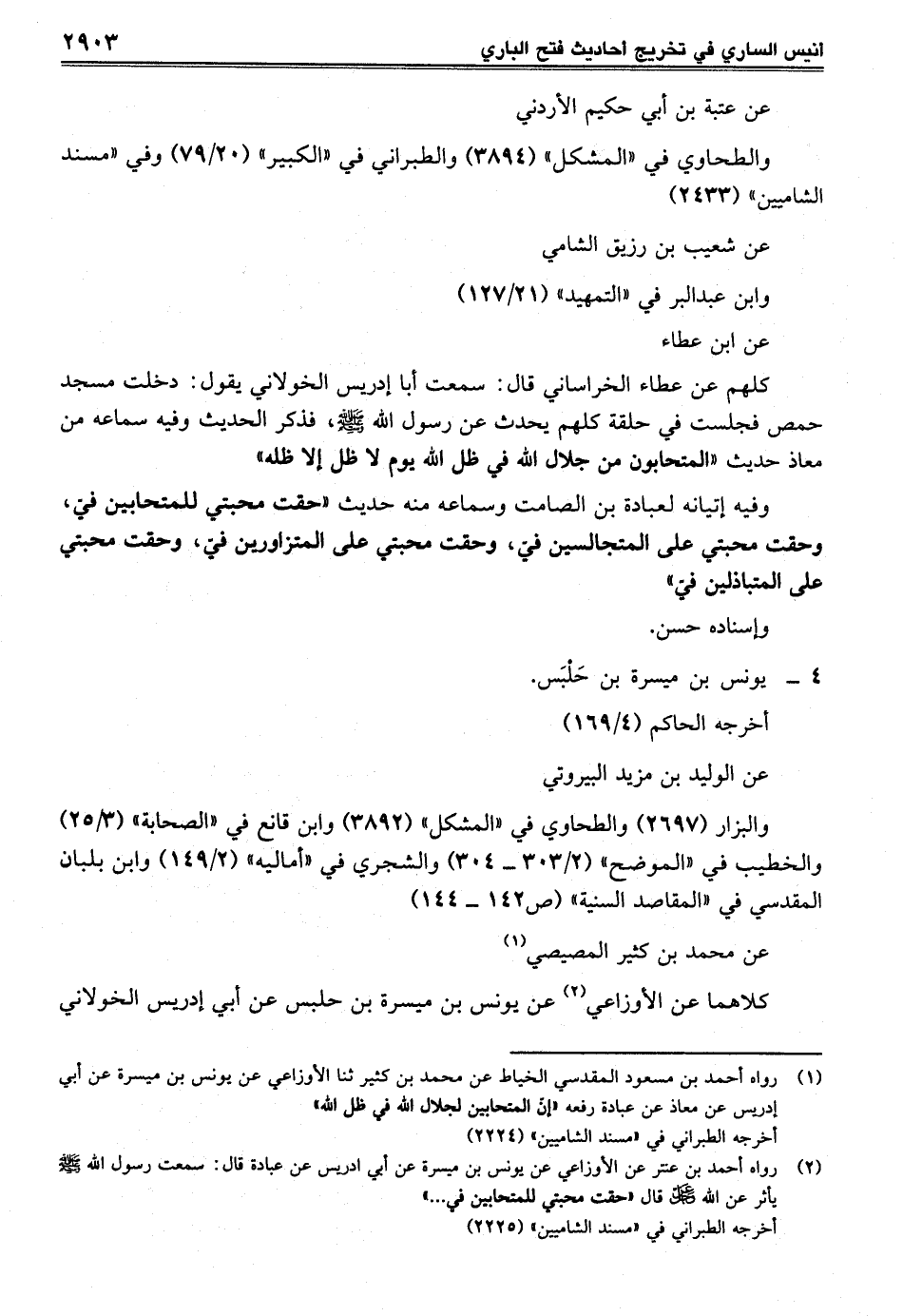 (¬1) رواه أحمد بن مسعود المقدسي الخياط عن محمد بن كثير ثنا الأوزاعي عن يونس بن ميسرة عن أبي إدريس عن معاذ عن عبادة رفعه "إنّ المتحابين لجلال الله في ظل الله"