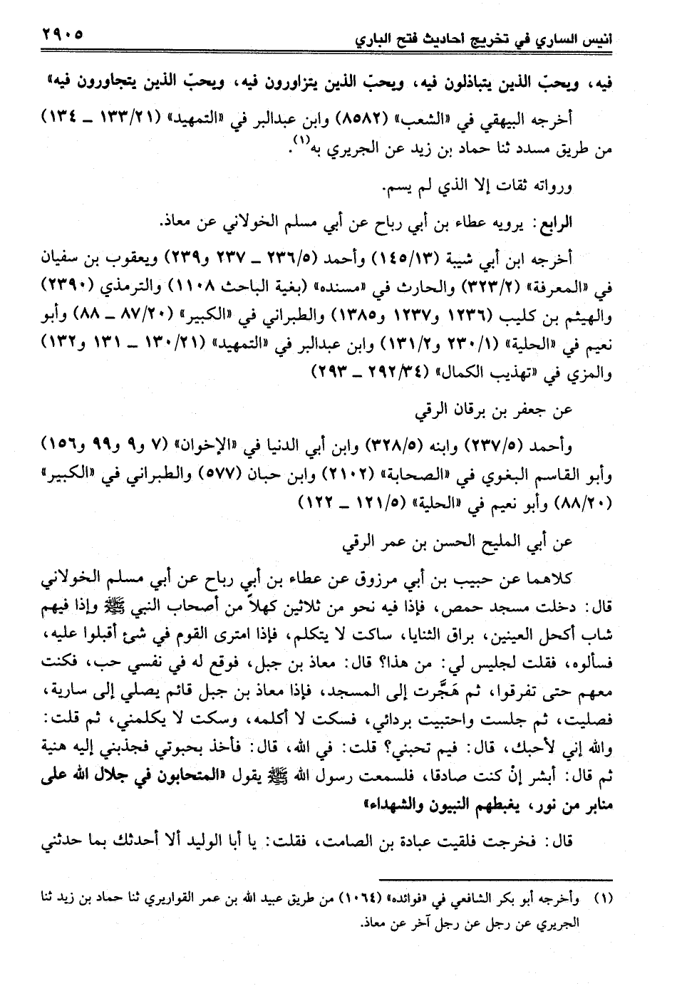 كلاهما عن حبيب بن أبي مرزوق عن عطاء بن أبي رباح عن أبي مسلم الخولاني قال: دخلت مسجد حمص، فإذا فيه نحو من ثلاثين كهلًا من أصحاب النبي - صلى الله عليه وسلم - وإذا فيهم شاب أكحل العينين، براق الثنايا، ساكت لا يتكلم، فإذا امترى القوم في شئ أقبلوا عليه، فسألوه، فقلت لجليس لي: من هذا؟ قال: معاذ بن جبل، فوقع له في نفسي حب، فكنت معهم حتى تفرقوا، ثم هَجَّرت إلى المسجد، فإذا معاذ بن جبل قائم يصلي إلى سارية، فصليت، ثم جلست واحتبيت بردائي، فسكت لا أكلمه، وسكت لا يكلمني، ثم قلت: والله إني لأحبك، قال: فيم تحبني؟ قلت: في الله، قال: فأخذ بحبوتي فجذبني إليه هنية ثم قال: أبشر إنْ كنت صادقا، فلسمعت رسول الله -صلى الله عليه وسلم- يقول "المتحابون في جلال الله على منابر من نور، يغبطهم النبيون والشهداء"