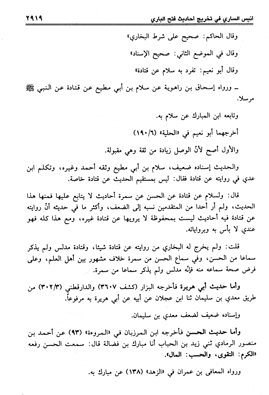 قال: ولسلام عن قتادة عن الحسن عن سمرة أحاديث لا يتابع عليها فمنها هذا الحديث، ولم أر أحدا من المتقدمين نسبه إلى الضعف، وأكثر ما في حديثه أنّ روايته عن قتادة فيه أحاديث ليست بمحفوظة لا يرويها عن قتادة غيره، ومع هذا كله فهو عندي لا بأس به وبرواياته.
