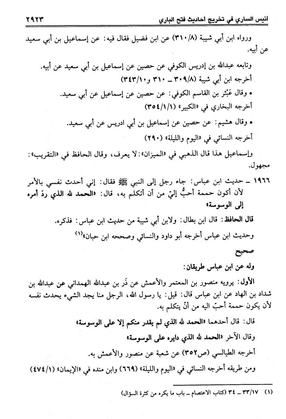 1966 - حديث ابن عباس: جاء رجل إلى النبي - صلى الله عليه وسلم - فقال: إني أحدث نفسي بالأمر لأن أكون حممة أحبُّ إليّ من أن أتكلم به، قال: "الحمد لله الذي ردّ أمره إلى الوسوسة"