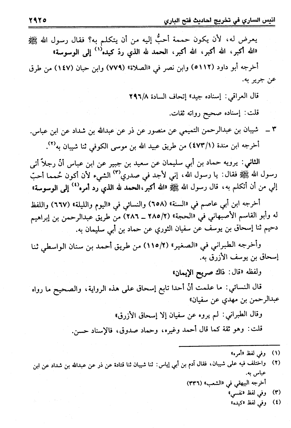 الثاني: يرويه حماد بن أبي سليمان عن سعيد بن جبير عن ابن عباس أنّ رجلًا أتى رسول الله - صلى الله عليه وسلم - فقال: يا رسول الله، إني لأجد في صدري (¬3) الشيء لأن أكون حُمما أحبّ إلى من أن أتكلم به، قال رسول الله - صلى الله عليه وسلم - "الله أكبر، الحمد لله الذي رد أمره (¬4) إلى الوسوسة"