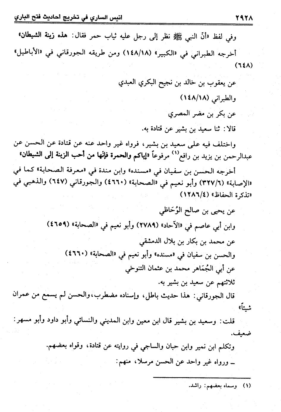 واختلف فيه على سعيد بن بشير، فرواه غير واحد عنه عن قتادة عن الحسن عن عبد الرحمن بن يزيد بن رافع (¬1) مرفوعا "إياكم والحمرة فإنّها من أحب الزينة إلى الشيطان"