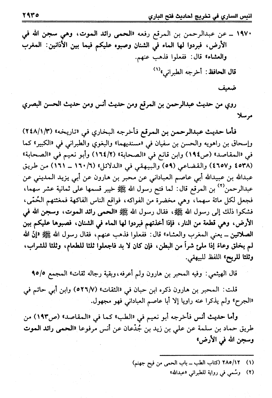 1970 - عن عبد الرحمن بن المرقع رفعه "الحمى رائد الموت، وهي سجن الله في الأرض، فبردوا لها الماء في الشنان وصبوه عليكم فيما بين الأذانين: المغرب والعشاء" قال: ففعلوا فذهب عنهم.