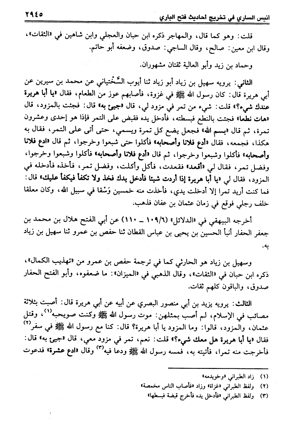 الثاني: يرويه سهيل بن زياد أبو زياد ثنا أيوب السَّخْتياني عن محمد بن سيرين عن أبي هريرة قال: كان رسول الله - صلى الله عليه وسلم - في غزوة، فأصابهم عوز من الطعام، فقال "يا أبا هريرة عندك شيء؟ " قلت: شيء من تمر في مزود لي، قال "جيئ به" قال: فجئت بالمزود، قال "هات نطعا" فجئت بالنطع فبسطته، فأدخل يده فقبض على التمر فإذا هو إحدى وعشرون تمرة، ثم قال "بسم الله" فجعل يضع كل تمرة ويسمي، حتى أتى على التمر، فقال به هكذا، فجمعه، فقال "أدع فلانا وأصحابه" فأكلوا حتى شبعوا وخرجوا، ثم قال "ادع فلانا وأصحابه" فأكلوا وشبعوا وخرجوا، ثم قال "أدع فلانا وأصحابه" فأكلوا وشبعوا وخرجوا، وفضل تمر، فقال لي "أقعد" فقعدت، فأكل وأكلت، وفضل تمر، فأخذه فأدخله في المزود، فقال لي "يا أبا هريرة إذا أردت شيئا فأدخل يدك فخذ ولا تكفأ فيكفأ عليك" قال: فما كنت أريد تمرا إلا أدخلت يدي، فأخذت منه خمسين وَسْقا في سبيل الله، وكان معلقا خلف رجلي فوقع في زمان عثمان بن عفان فذهب.