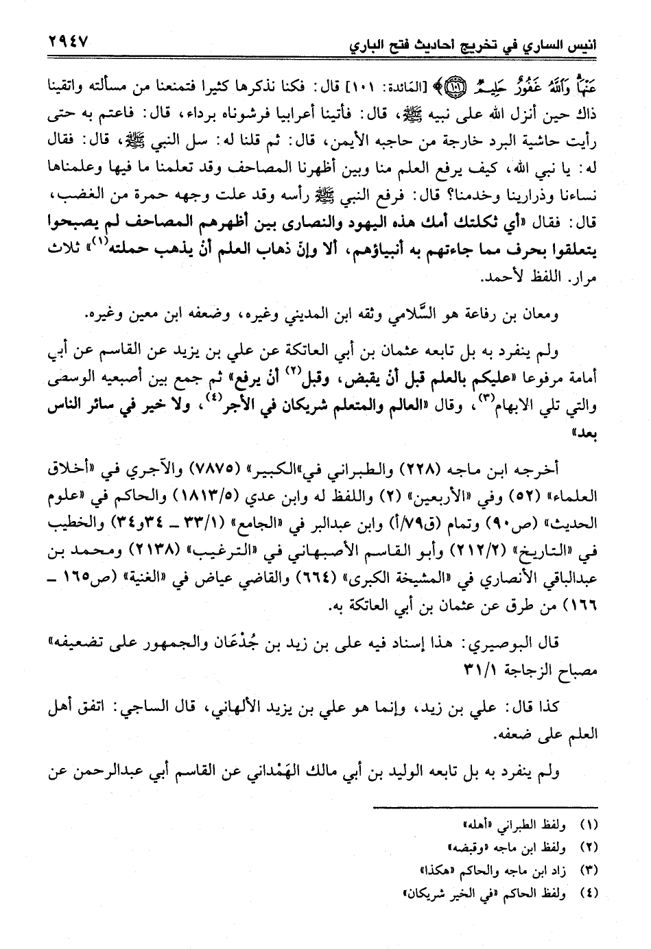 عَنْهَا وَاللَّهُ غَفُورٌ حَلِيمٌ (101)} [المائدة: 101] قال: فكنا نذكرها كثيرا فتمنعنا من مسألته واتقينا ذاك حين أنزل الله على نبيه - صلى الله عليه وسلم -، قال: فأتينا أعرابيا فرشوناه برداء، قال: فاعتم به حتى رأيت حاشية البرد خارجة من حاجبه الأيمن، قال: ثم قلنا له: سل النبي - صلى الله عليه وسلم -، قال: فقال له: يا نبي الله، كيف يرفع العلم منا وبين أظهرنا المصاحف وقد تعلمنا ما فيها وعلمناها نساءنا وذرارينا وخدمنا؟ قال: فرفع النبي - صلى الله عليه وسلم - رأسه وقد علت وجهه حمرة من الغضب، قال: فقال "أي ثكلتك أمك هذه اليهود والنصارى بين أظهرهم المصاحف لم يصبحوا يتعلقوا بحرف مما جاءتهم به أنبياؤهم، ألا وإنّ ذهاب العلم أنْ يذهب حملته (¬1) " ثلاث مرار. اللفظ لأحمد.