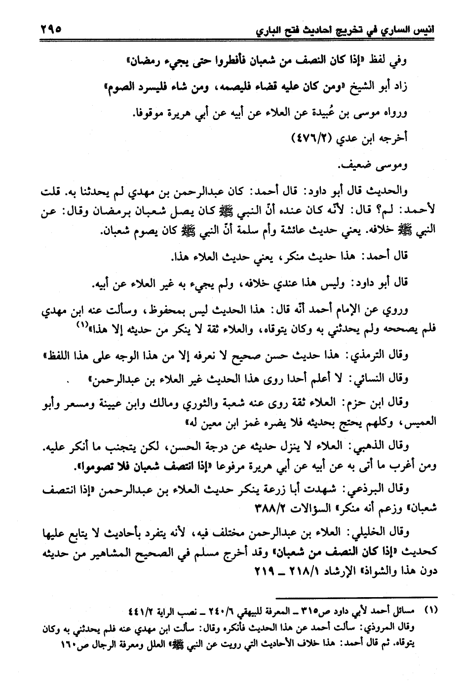 وقال الخليلي: العلاء بن عبد الرحمن مختلف فيه، لأنه يتفرد بأحاديث لا يتابع عليها كحديث "إذا كان النصف من شعبان" وقد أخرج مسلم في الصحيح المشاهير من حديثه دون هذا والشواذ" الإرشاد 1/ 218 - 219