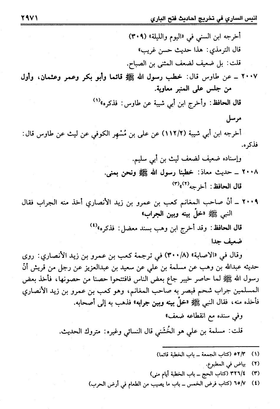 2007 - عن طاوس قال: خطب رسول الله - صلى الله عليه وسلم - قائما وأبو بكر وعمر وعثمان، وأول من جلس على المنبر معاوية.