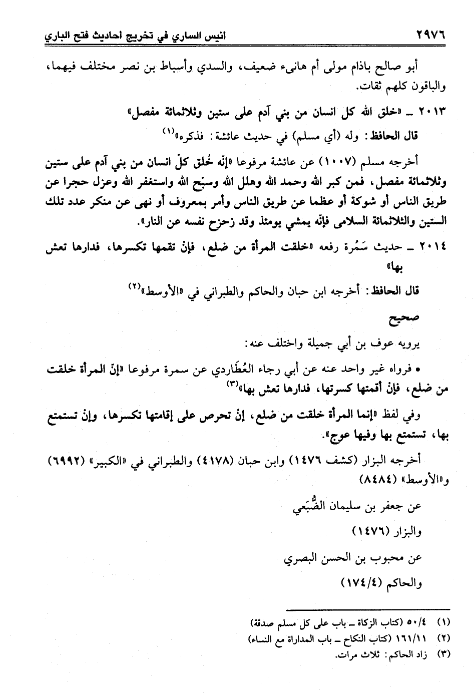 2014 - حديث سَمُرة رفعه "خلقت المرأة من ضلع، فإنْ تقمها تكسرها، فدارها تعش بها"