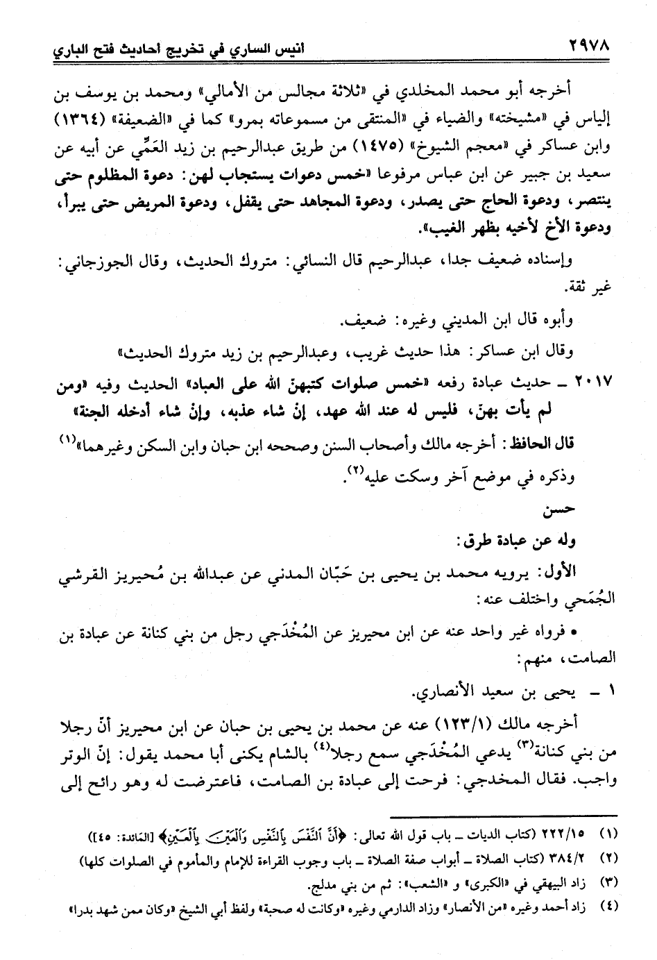 2017 - حديث عبادة رفعه "خمس صلوات كتبهنّ الله على العباد" الحديث وفيه "ومن لم يأت بهنّ، فليس له عند الله عهد، إنْ شاء عذبه، وإنْ شاء أدخله الجنة"