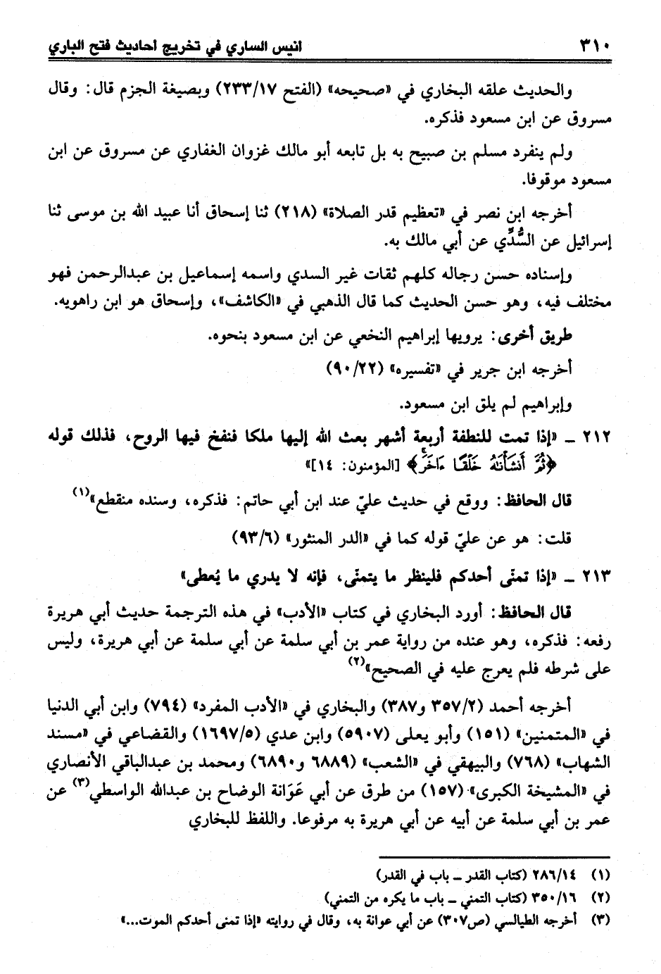 212 - "إذا تمت للنطفة أربعة أشهر بعث الله إليها ملكا فنفخ فيها الروح، فذلك قوله {ثُمَّ أَنْشَأْنَاهُ خَلْقًا آخَرَ} [المؤمنون: 14] "