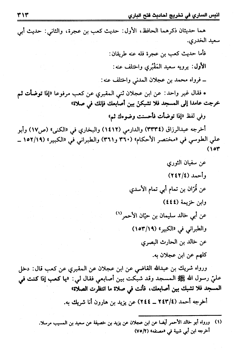 • فقال غير واحد: عن ابن عجلان ثني المقبري عن كعب مرفوعا "إذا توضأت ثم خرجت عامدا إلى المسجد فلا تشبكنّ بين أصابعك فإنك في صلاة"