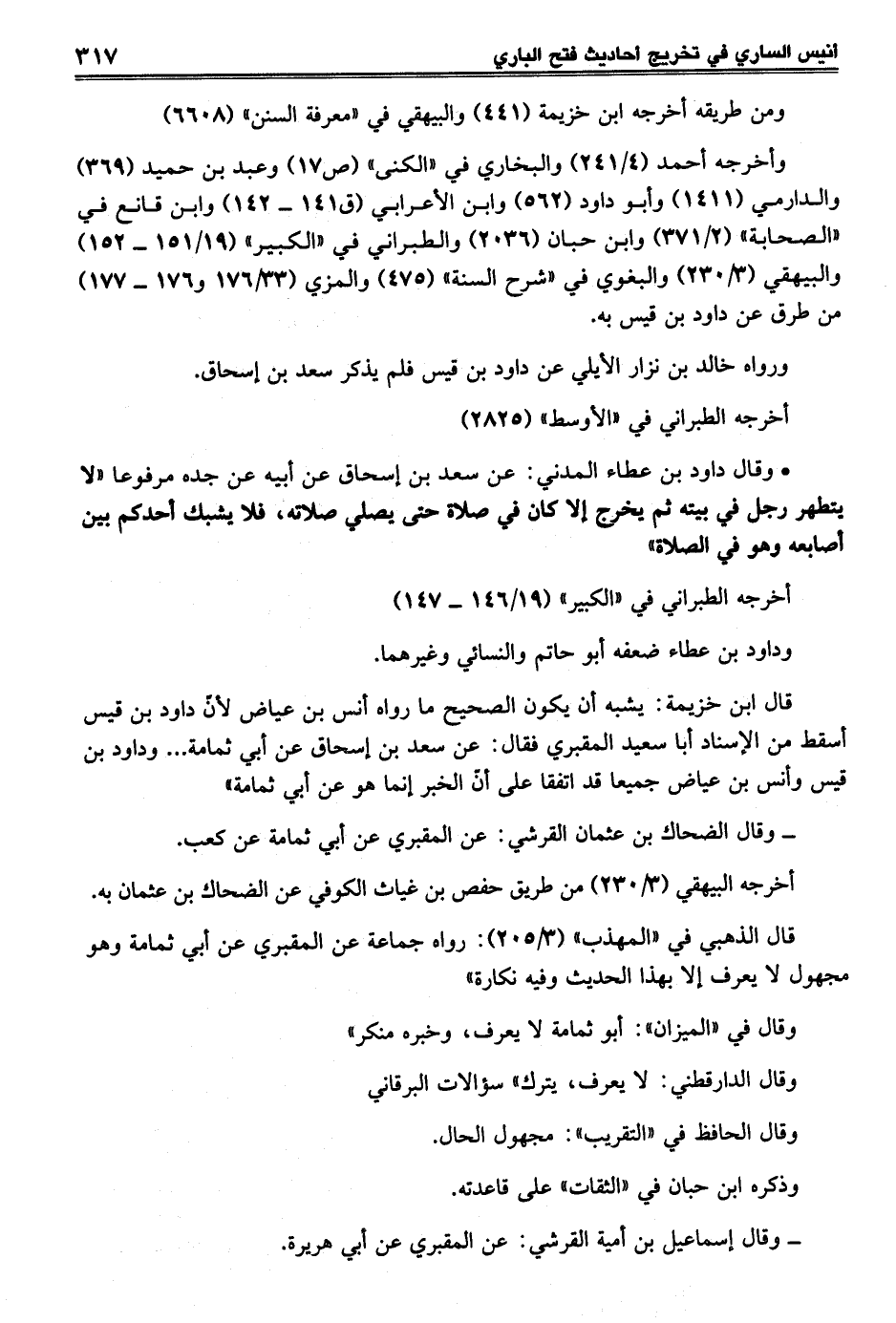 قال ابن خزيمة: يشبه أن يكون الصحيح ما رواه أنس بن عياض لأنّ داود بن قيس أسقط من الإسناد أبا سعيد المقبري فقال: عن سعد بن إسحاق عن أبي ثمامة ... وداود بن قيس وأنس بن عياض جميعا قد اتفقا على أنّ الخبر إنما هو عن أبي ثمامة"