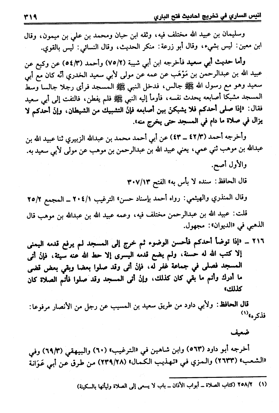 وأما حديث أبي سعيد فأخرجه ابن أبي شيبة (2/ 75) وأحمد (3/ 54) عن وكيع عن عبيد الله بن عبد الرحمن بن مَوْهَب عن عمه عن مولى لأبي سعيد الخدري أنّه كان مع أبي سعيد وهو مع رسول الله - صلى الله عليه وسلم - جالس، فدخل النبي - صلى الله عليه وسلم - المسجد فرأى رجلا جالسا وسط المسجد مشبكا أصابعه يحدث نفسه، فأومأ إليه النبي - صلى الله عليه وسلم - فلم يفطن، فالتفت إلى أبي سعيد فقال: "إذا صلى أحدكم فلا يشبكنّ بين أصابعه فإنّ التشبيك من الشيطان، وإنّ أحدكم لا يزال في صلاة ما دام في المسجد حتى يخرج منه".