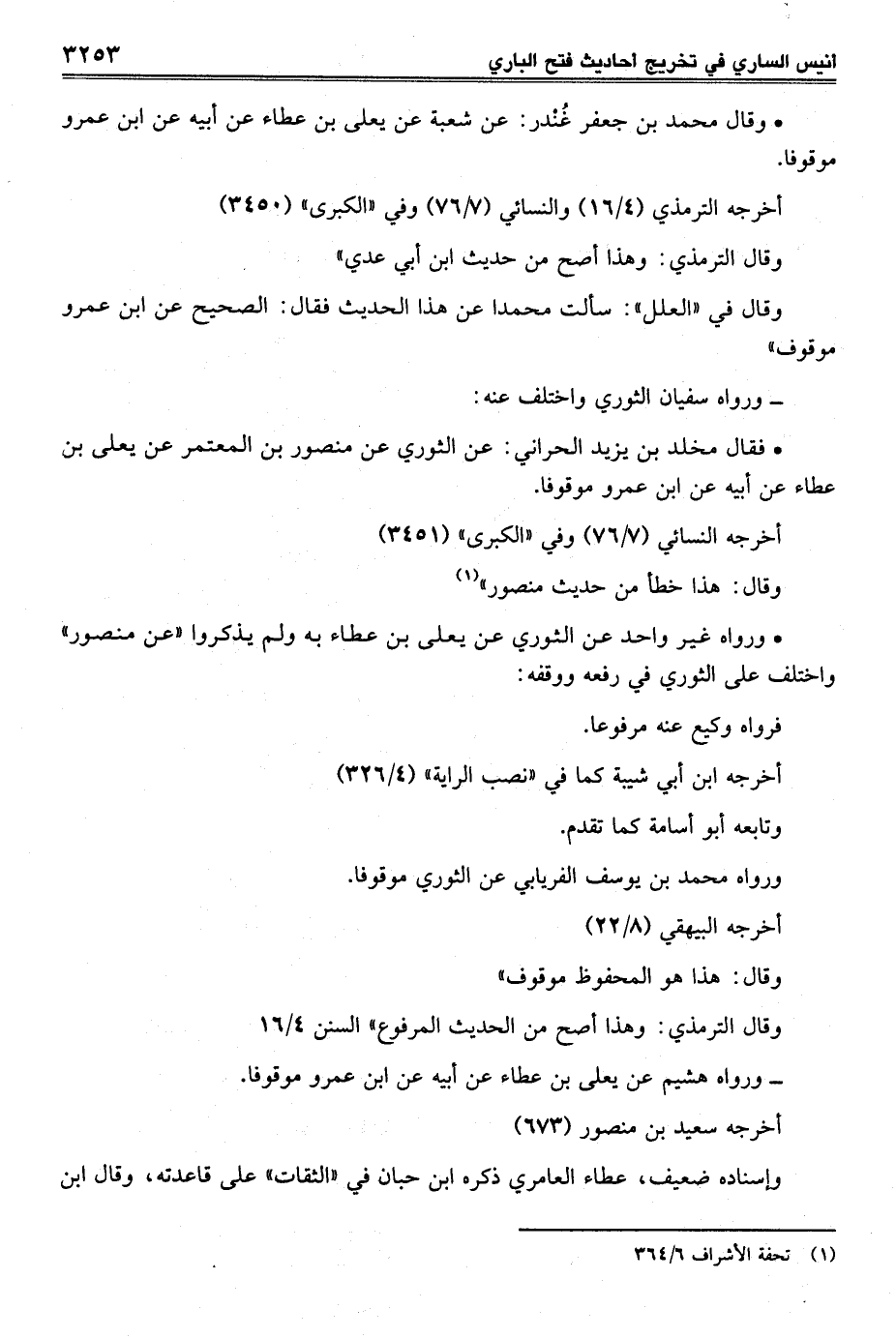 • فقال مخلد بن يزيد الحراني: عن الثوري عن منصور بن المعتمر عن يعلى بن عطاء عن أبيه عن ابن عمرو موقوفاً.