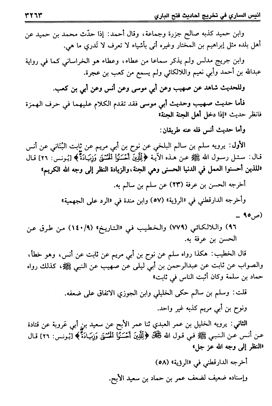 الثاني: يرويه الخليل بن عمر العبدي ثنا عمر الأبح عن سعيد بن أبي عَروبة عن قتادة عن أنس عن النبي - صلى الله عليه وسلم - في قول الله -عز وجل- {لِلَّذِينَ أَحْسَنُوا الْحُسْنَى وَزِيَادَةٌ} [يونس: 26] قال "النظر إلى وجه الله عز جل"