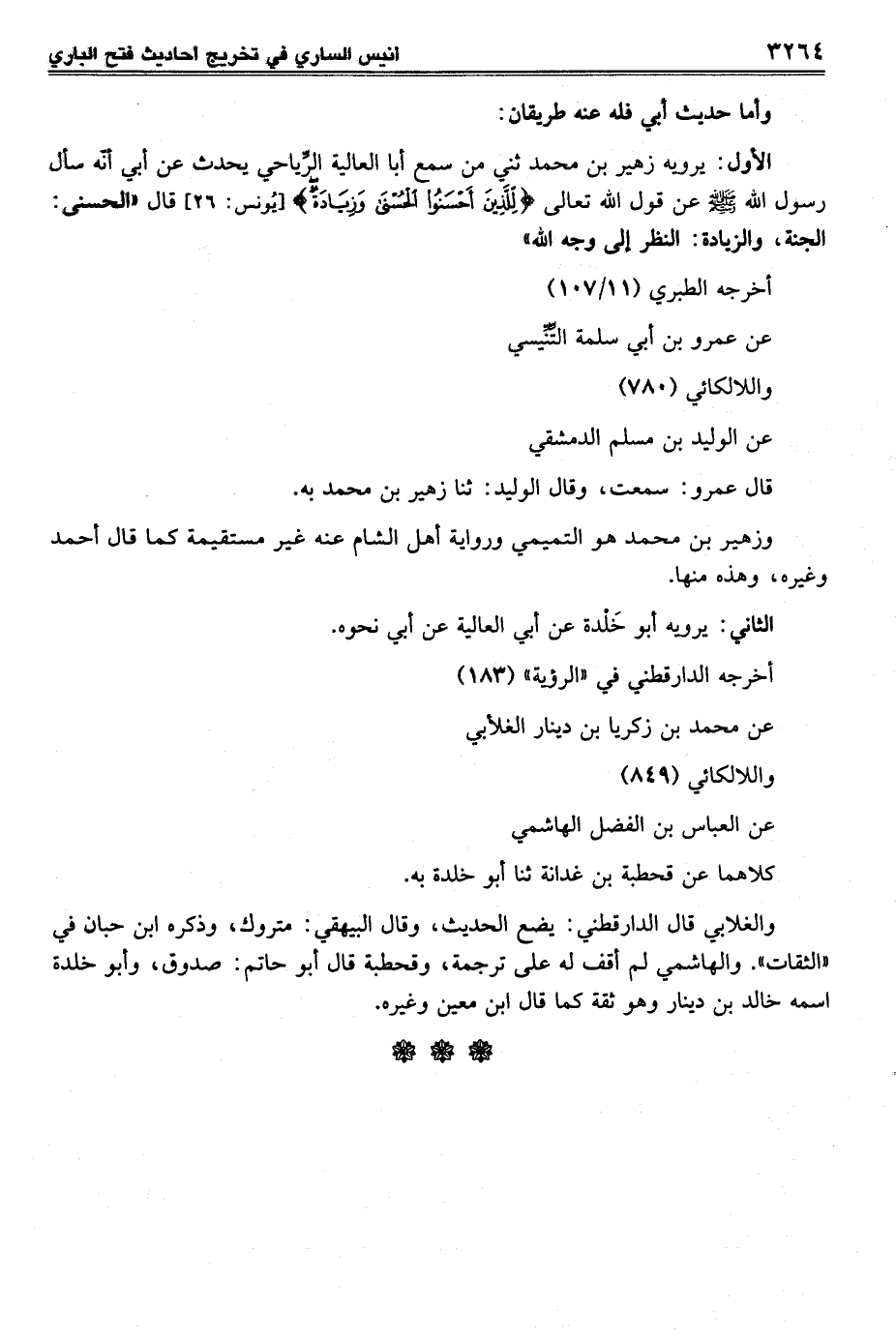 الأول: يرويه زهير بن محمد ثني من سمع أبا العالية الرِّياحي يحدث عن أبي أنّه سأل رسول الله - صلى الله عليه وسلم - عن قول الله تعالى {لِلَّذِينَ أَحْسَنُوا الْحُسْنَى وَزِيَادَةٌ} [يونس: 26] قال "الحسنى: الجنة، والزيادة: النظر إلى وجه الله"