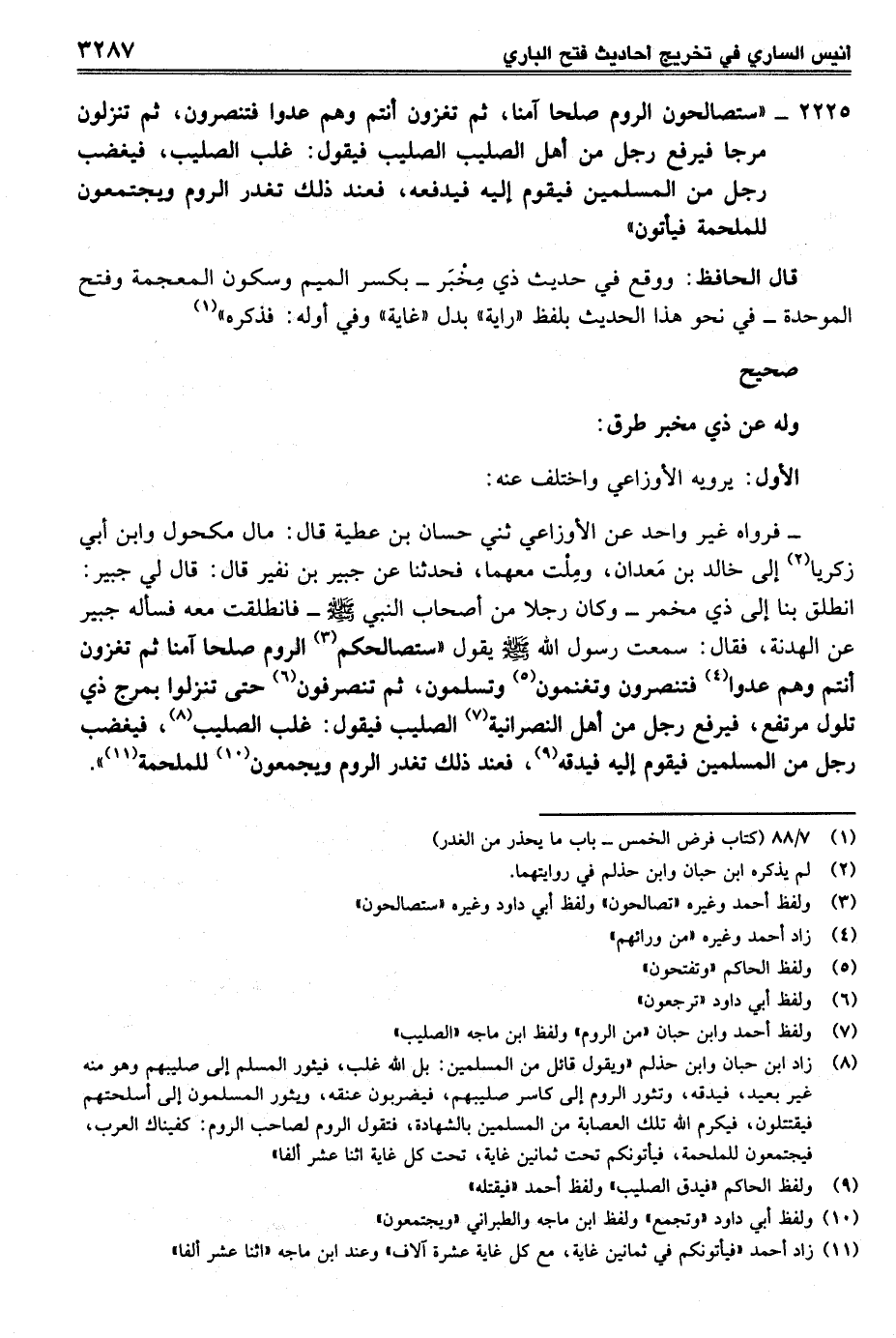 2225 - "ستصالحون الروم صلحاً آمنا، ثم تغزون أنتم وهم عدواً فتنصرون، ثم تنزلون مرجاً فيرفع رجل من أهل الصليب الصليب فيقول: غلب الصليب، فيغضب رجل من المسلمين فيقوم إليه فيدفعه، فعند ذلك تغدر الروم ويجتمعون للملحمة فيأتون"
